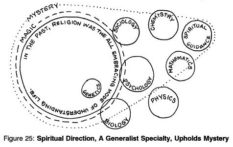 Certainly, at the present time, among those of us who help others to sustain or regain the sense of mystery on their life journeys and not lose their souls, there need to be some skilled helpers who integrate the "specializations" in their approach. It is my contention that the work of spiritual direction should do this. Perhaps other fields ought to do this too, but it is obvious that the very work of taking care of the soul should exercise this integrating goal.Ultimately the separate boxes have been further fragmented into a multiplicity of more precise and discrete boxes through specializations. We have succumbed to the false belief that the more information or the more discrete units of information which a person possesses, the more one can live wholesomely. In Western civilization, any field of knowledge, such as philosophy, theology, art, etc., that does not use a scientific paradigm, is devalued. Church-related universities, like their secular counterparts, were led into the same bias which stresses that the "really real" is in the conscious, logical mind and, consequently, devalues other modes of knowing that are not scientifically measurable. Until the mid-twentieth century, there still was a thread of sacred rapport to which all North Americans ascribed and which gave us, even with our pluralism, a cohesive way of understanding life. Now, however, at the end of this century, that precious thread which our Western culture once took for granted no longer exists. The originating triple circle of the diagram below represents primitive society which understood all knowledge as being one with the realm of magic, religion, and mystery.